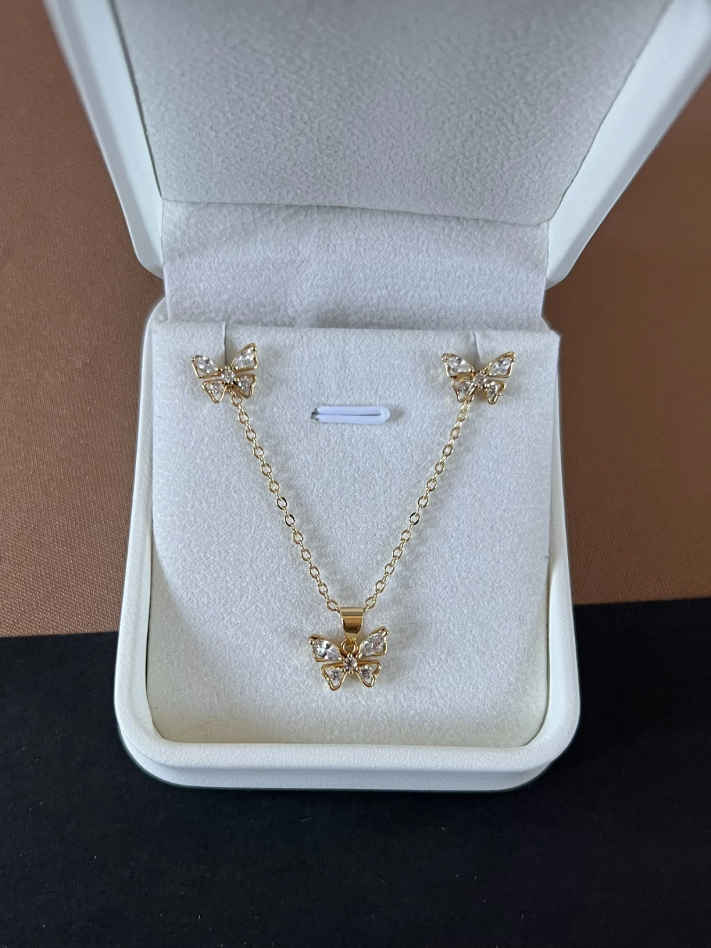 Conjunto de borboleta com cristais, malha com 45cm e brinco combinando, banhado a ouro 18K e hipoalergênico.