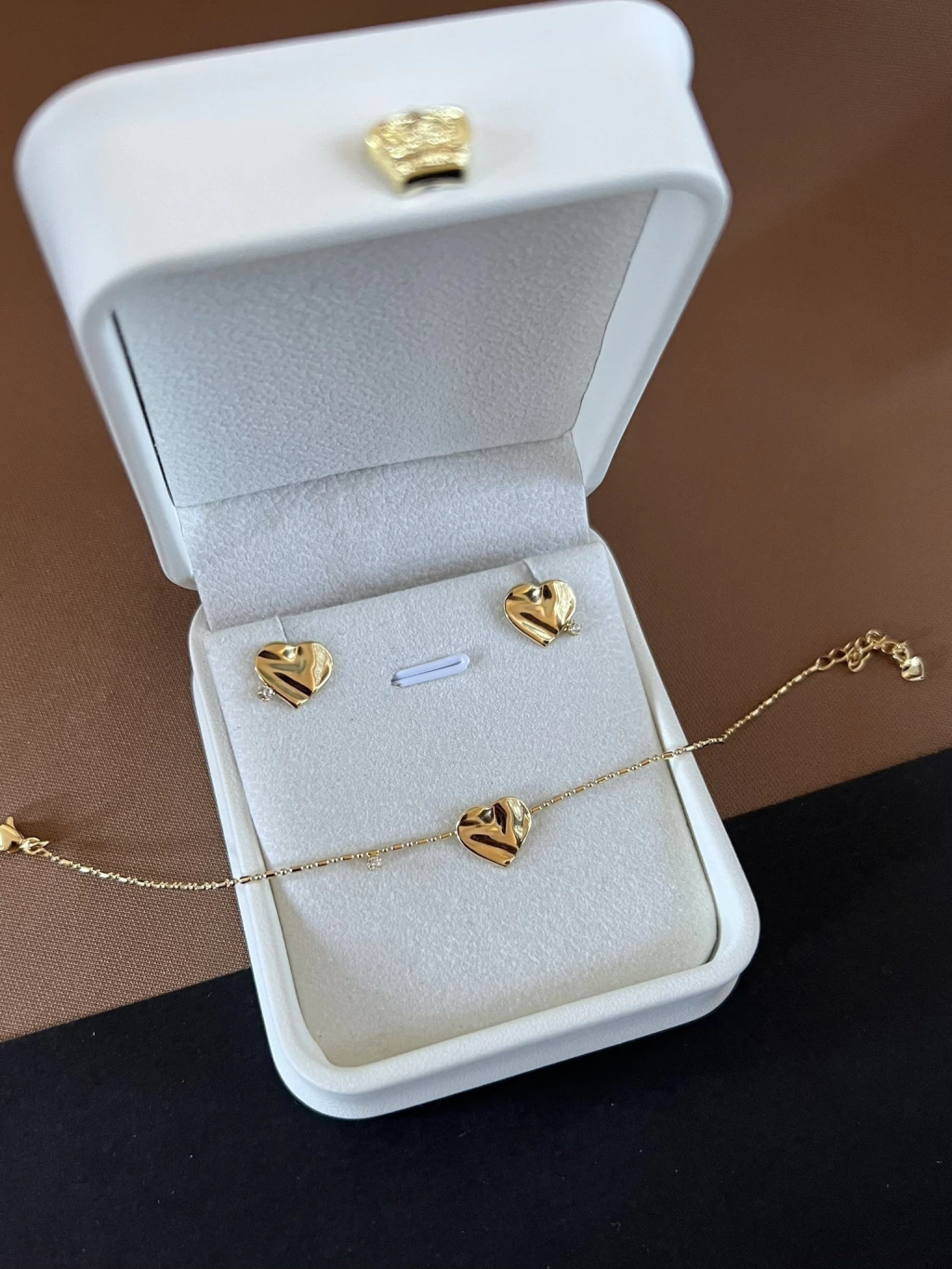 Conjunto de pulseira com coração de placa orgânica, possui 16,5 de largura + 5cm de extensor, e brinco combinando, banhado a ouro 18K e hipoalergênico.