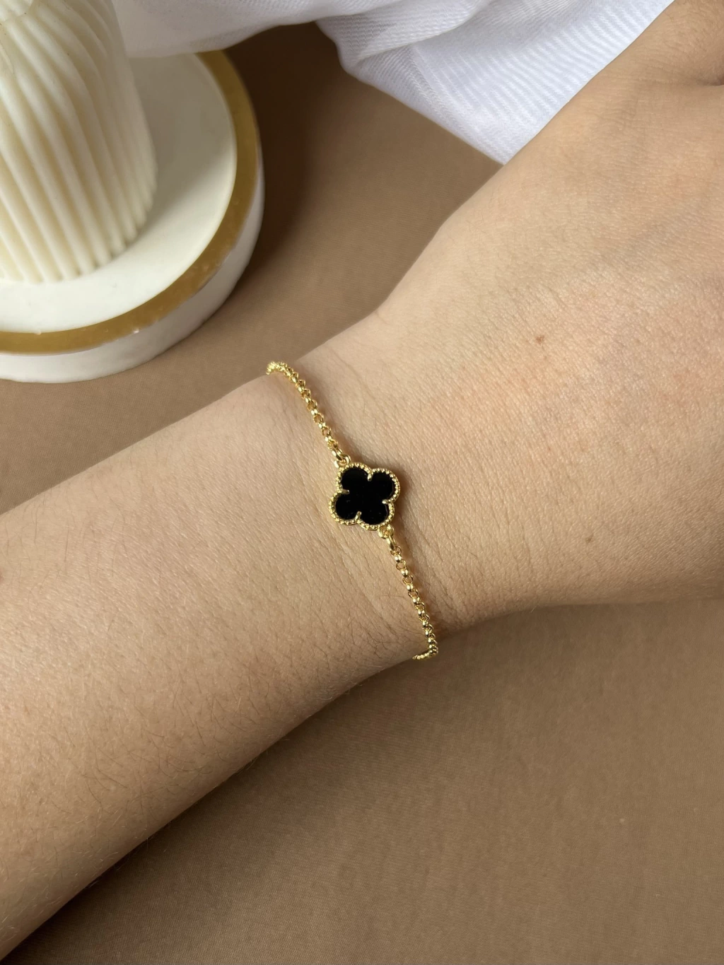 Pulseira com malha de elo porguês com 2mm, super delicada, com trevo preto, transmitindo força e estilo.